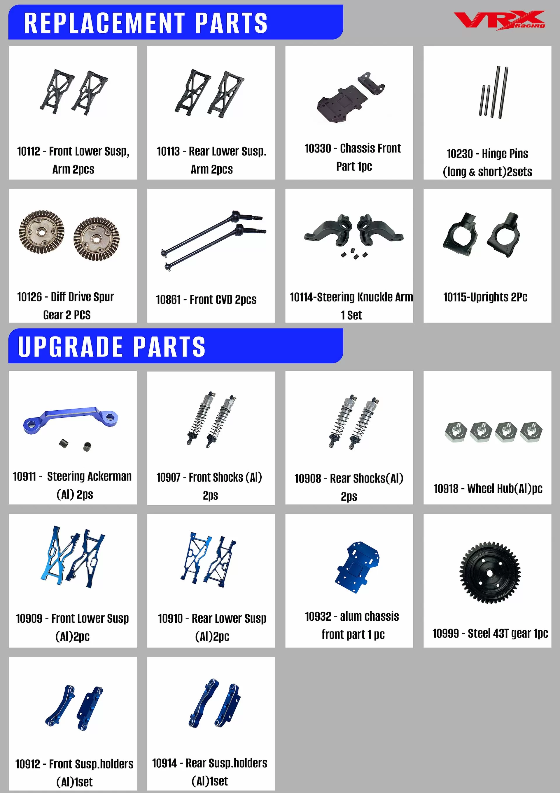 نظام تعليق قابل للتعديل بالكامل بما في ذلك ، تدلى ، كامبر ، إصبع القدم ، قاعدة العجلات وغيرها ، من خلال ضبط نظام التعليق ، يمكن للاعبين تحسين أداء سيارتهم بناءً على ظروف المسار واحتياجات القيادة ، ضبط التعليق ليناسب الأسطح المختلفة (e. ز ،مسارات سلسة ، التضاريس على الطرق الوعرة). يمتص الصدمات بفعالية أثناء القفزات أو التضاريس الوعرة ، ويحمي الشاسيه والإلكترونيات. يُحسّن ملامسة الإطار للأرض من أجل تحسين الإمساك والسحب.