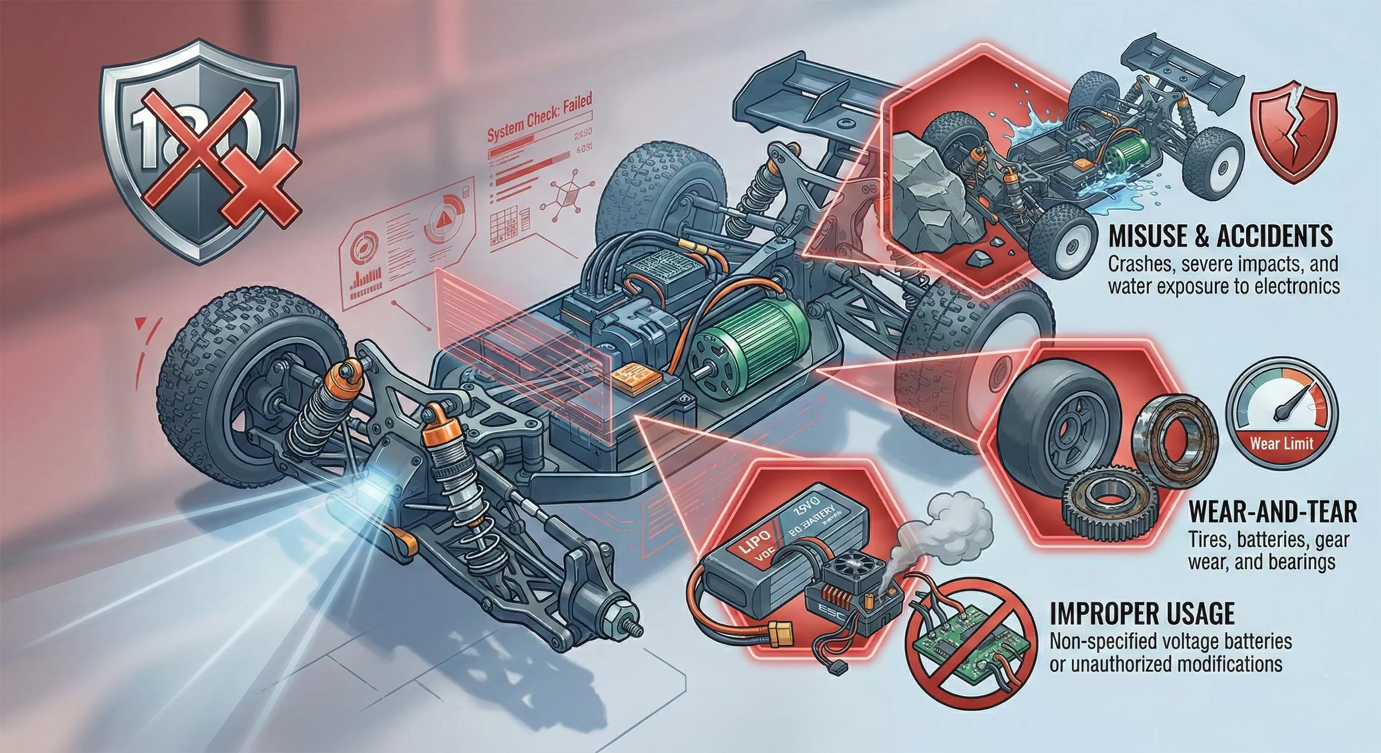 تعديل غير مصرح به:الضرر الناجم عن أجزاء ما بعد البيع غير المتوافقة أو التعديلات الكهربائية/الهيكلية ذاتية الصنع.
